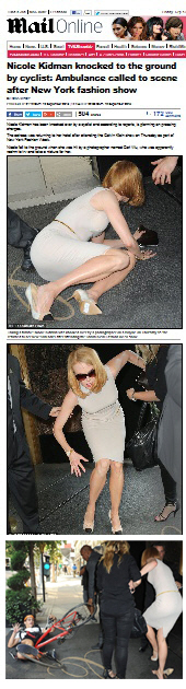 유명 여배우 니콜 키드먼(46)이 자전거를 탄 카메라맨과 충돌해 넘어지는 수모를 당했다.