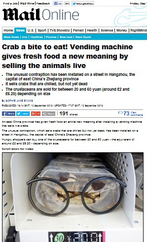 살아있는 게를 판매하는 자판기가 등장해 화제다.