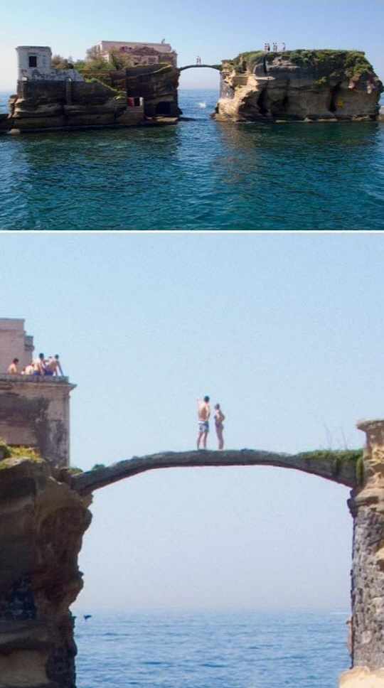 '저주받은 돌다리 섬'의 사진 속 풍경은 이탈리아 나폴리에 있는 가이올라 섬으로 알려진다. 그러나 낭만적이고 아름다운 경치로 관광객들이 자주 찾는 곳이라는 이 섬이 '저주받는 섬'으로 불리는 이유가 있다.