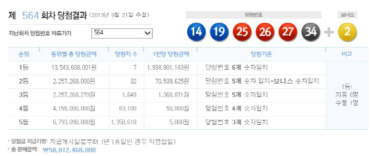 21일 제564회차 로또복권을 추첨한 결과, 1등에 당첨된 사람은 총 7명으로 각각 19억3480만원을 받게됐다.