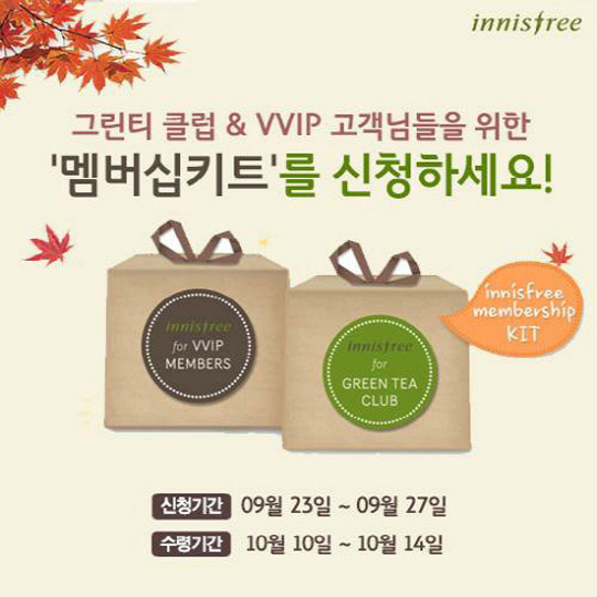 이니스프리는 23일 공식 페이스북을 통해 "그린티 클럽 및 VVIP회원을 대상으로 멤버십 키트 증정 행사 진행과 더불어 신청을 받는다"고 밝혔다.
