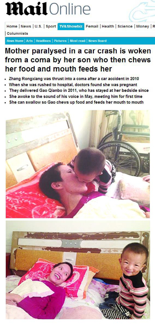 교통사고로 식물인간이 된 임산부가 의식이 없는 상태에서 아이를 출산하고, 태어난 아이 덕분에 약 3년만에 의식을 되찾았다.