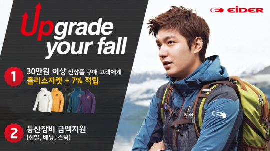 프랑스 아웃도어 브랜드 아이더(www.eider.co.kr)는 본격적인 가을 산행철을 맞아 오는 9월 26일부터 10월 20일까지 '업그레이드 유어 폴(Upgrade your Fall)' 이벤트를 진행한다고 밝혔다. 고객들이 보다 알뜰하게 가을 산행을 준비할 수 있도록 다양한 혜택을 마련한 것.