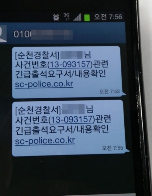 메시지에는 "[순천경찰서]OOO님 사건번호(13-000000) 관련 긴급출석요구서/내용확인"이라는 문구와 함께 정체불명의 인터넷 주소(sc-police.co.kr)가 적혀 있었다.