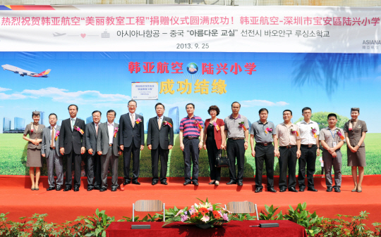 ◇아시아나항공 윤영두 사장(왼쪽에서 여섯번째)이 25일(수) 중국 선전시 바오안구 루싱소학교와 아름다운 교실 자매 결연식을 갖고, 양창수 주 광저우 총영사관 총영사(왼쪽에서 일곱번째), 정석균 경제영사 (왼쪽에서 다섯번째), 동진이 바오안구 교육국장(왼쪽에서 여덟번째), 왕펑란 교육위원회 비서장(왼쪽에서 아홉번째), 후쭤취안 루싱소학교 이사장(오른쪽에서 여섯번째), 천춘펑 루싱소학교 교장(오른쪽에서 다섯번째)과 함께 기념촬영을 하고 있다.