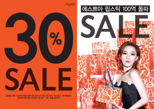에스쁘아 관계자는 "고객들의 꾸준한 사랑으로 어느덧 립스틱 100억 돌파라는 의미 있는 결실을 맺게 됐다"며 "감사의 뜻으로 마련한 이번 세일을 통해 평소 눈 여겨 보았던 에스쁘아의 다양한 메이크업 제품을 부담 없이 만나보기를 바란다"고 전했다.