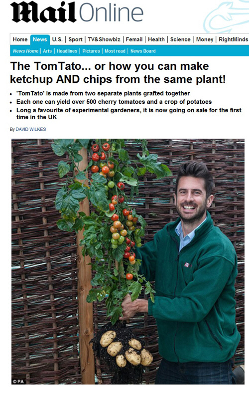 고난도의 접목기술을 이용해 만든 이 나무는 '톰테이토'라 불리며, 500개의 토마토 뿐만 아니라 감자까지 동시에 열린 것으로 알려졌다.
