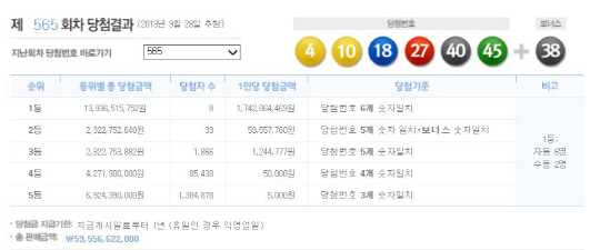 28일 제565회차 로또복권을 추첨한 결과, 1등에 당첨된 사람은 총 8명으로 각각 17억4206만원을 받게됐다.