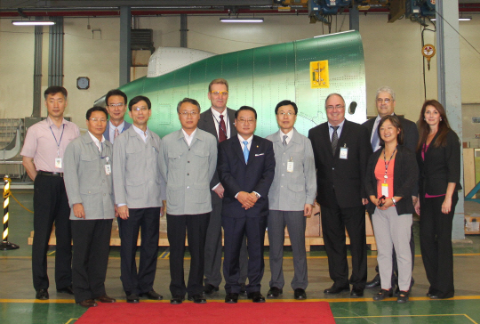 | 최근 부산시 대저동 소재 테크센터에서 개최된 KC-46 공중급유기 후방동체 구조물 첫 제품 납품 기념 행사에서 최준철 대한항공 항공우주사업본부장(왼쪽 여덟 번째), 트로이 김 보잉사 아시아 지역본부 담당 임원(왼쪽 일곱 번째) 등 양사 관계자들이 기념사진을 촬영하고 있다. |