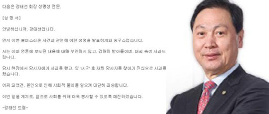 강 회장은 30일 공식 성명서를 통해 "불미스러운 사건과 관련해 이런 성명을 발표하게 돼 송구스럽다"면서 "저는 언론에 보도된 내용에 대해 부인하지 않고 겸허히 받아들이며 머리 숙여 사과드립니다"라고 적었다.