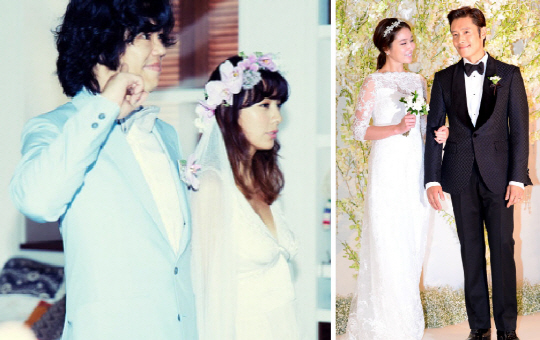 #결혼식 풍경 1 : 신부 이효리는 화려한 웨딩드레스도, 두꺼운 신부화장도 없이 직접 구입한 드레스를 입고 머리에는 화관을 쓴 소박한 신부였고 이상순 역시 파란 턱시도를 입은 수수한 신랑이었다.