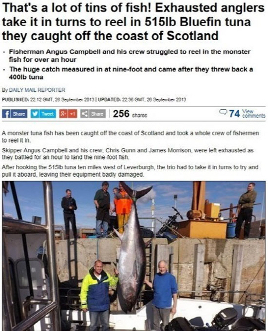 26일(현지시각) 영국 데일리메일은 스코틀랜드의 해안에서 무게 233kg이 넘는 참다랑어를 포획한 사실을 전했다.