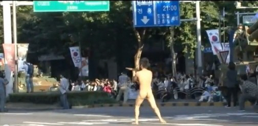 독립영화 감독 강의석(28)이 국군의 날을 맞아 서울 용산구 전쟁기념관에서 '누드 퍼포먼스'를 진행했다.