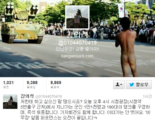 독립영화 감독 강의석(28)이 국군의 날 기념에 반대하는 '누드 퍼포먼스'를 벌였다.