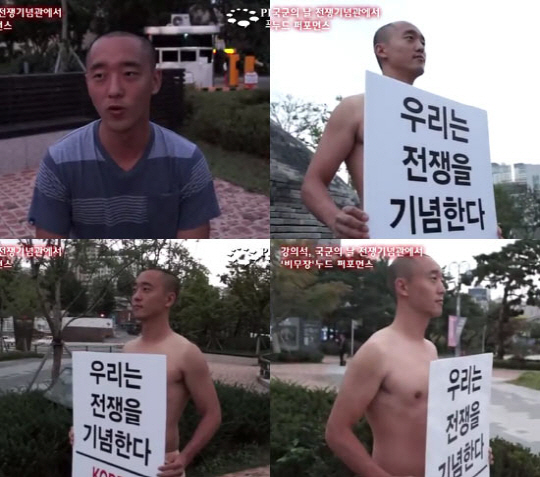 강의석 독립영화 감독이 국군의 날을 맞아 이번에는 전쟁기념관 '형제의 상' 앞에서 누드 퍼포먼스를 진행했다.