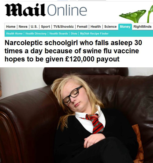 최근 영국의학잡지에 실린 자료를 보면 75명의 소아 기면증 환자를 분석한 결과 이중 11명의 소아가 백신 투여 후 이런 증상이 나타난 것으로 조사됐다.
