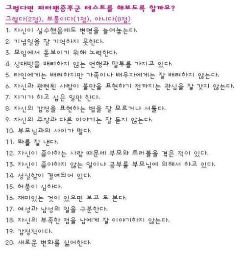 '피터팬 증후군 테스트'라는 제목으로 피터팬 증후군을 자가 진단할 수 있는 질문들이 공개돼 네티즌들의 이목을 집중시켰다.