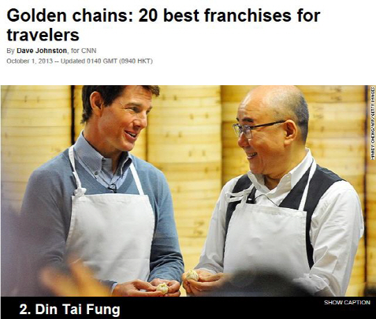 대만의 '딘타이펑'이 CNN이 운영하는 여행전문사이트 'CNN TRAVEL'에서 '여행자들을 위한 최고의 프랜차이즈' 2위에 올랐다. 딘타이펑은 미국의 대표 프랜차이즈 '맥도널드'와 '스타벅스'보다 상위에 선정, 레스토랑 부문으로는 1위에 올랐다.