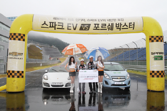 한국지엠은 지난달 29일 인제서킷에서 열린 CJ헬로리번 슈퍼레이스 6전 결선레이스에 앞서 첫 순수전기차 쉐보레 스파크EV와 스포츠카의 이색 스피드 대결을 펼쳐 경기장을 찾은 모터스포츠 팬들의 이목을 사로잡았다.