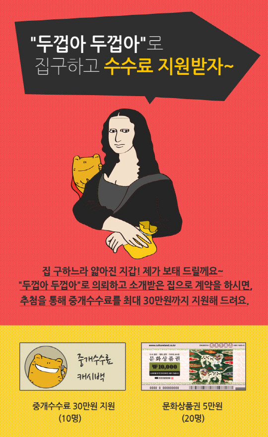 드림피어는 고객회원이 10월 중 '두껍아 두껍아' 앱을 통해 추천받은 집을 계약할 경우 응모자 중 추첨을 통해 최대 30만원까지 중개수수료를 지원해준다. '두껍아 두껍아' 앱을 통해 집도 구하고 수수료도 지원받을 수 있는 것이다. 이같은 이벤트는 서울 및 경기소재 매물계약 건을 대상으로 하며 중복신청은 되지않는다. 자세한 이벤트 응모방법 및 당첨자 안내는 이 앱의 이벤트 공지를 참조하면 된다. 또 '두껍아 두껍아' 앱을 주변에 많이 소개한 사람 중 3명에게 '넥서스7 2세대'를 지급하는 이벤트도 마련했다.