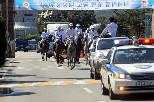◇순찰차가 승마단의 안전을 위해 경마공원 입구까지 에스코트하고 있다.