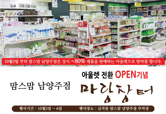 출산-유아용품 멀티숍 맘스맘(대표 김준석, www.momsmom.co.kr)은 10월 3일 맘스맘 남양주점을 아울렛 형태로 리뉴얼 오픈한다.