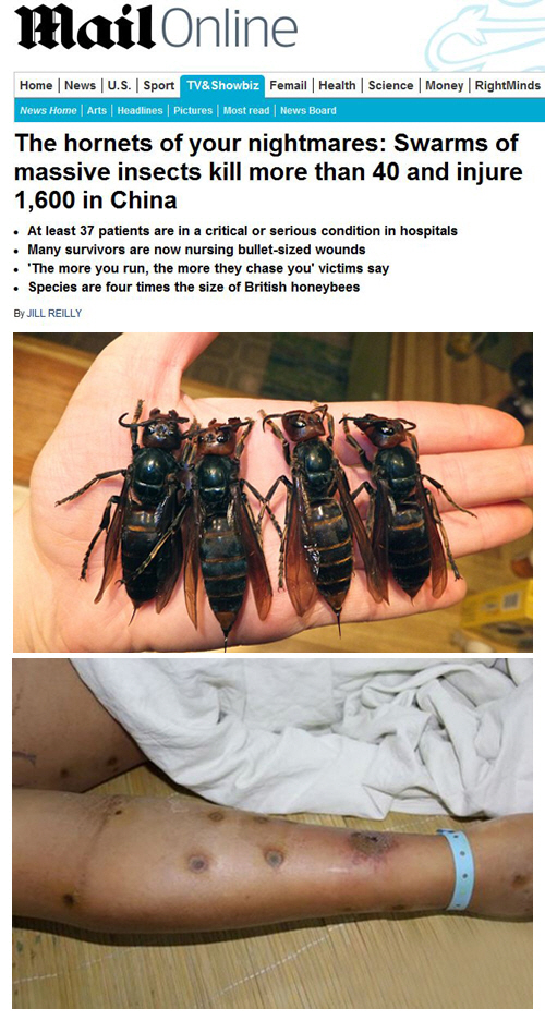 중국에서 '살인 말벌'이 기승을 부려 최근 3개월 동안 40명이 사망하고 1600여명이 부상을 당했다. 부상자 가운데 37명은 생명이 위태로운 상태인 것으로 알려졌다.