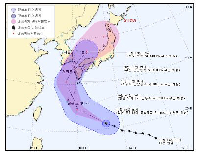 6일 오전 9시 현재 다나스의 중심기압은 970헥토파스칼(h㎩), 최대풍속 초속 36m, 강풍반경 330㎞의 강한 태풍으로 관측됐다.