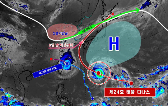 7일 국가태풍센터에 따르면 다나스는 8일 새벽 3시 서귀포 남쪽 약 490km 부근 해상까지 접근한다.