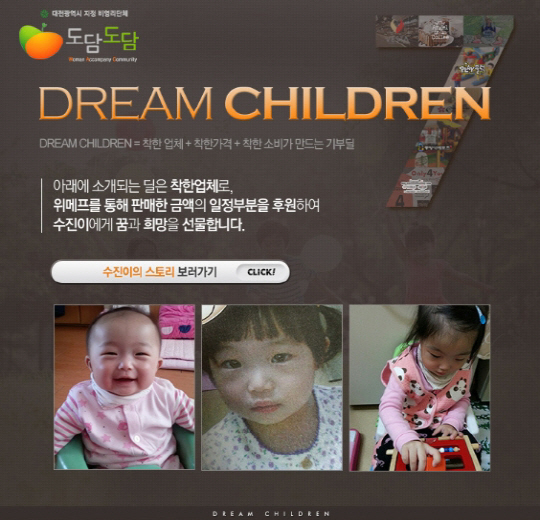 위메프는 대전을 대표하는 각 분야의 7개 업체들과 제휴를 맺고 판매한 금액의 일정 부분을 대전의 대표맘 카페인 도담도담에 기부한다. 7개 업체는 대전/ 충청 지역의 엔제리너스, 프리미엄 뷔페 VESTA, 찜질방 동방삭레포츠 등이다. 상품구매를 통한 기부뿐 아니라 위메프 잔여포인트나 1000원의 결제로 직접 기부할 수도 있다. 수익금을 기부하게 될 단체인 도담도담은 대전시가 지정한 대전 최대 임산부 / 육아맘 봉사단체이며 2006년 설립되어 현재 4만여 명의 회원이 활동하고 있다. 기획전 판매 종료 후 기부액과 기부현황은 홈페이지를 통해 공개될 예정이다.