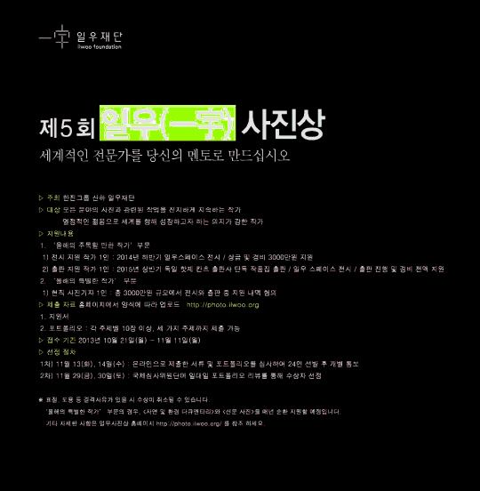 한진그룹 산하 공익 재단인 일우재단이 역량 있는 사진작가를 발굴해 세계적 작가로 육성하는 제 5회'일우(一宇) 사진상'공모를 시작한다. 일우 사진상은 예술, 다큐멘터리 등 영역에 제한을 두지 않고, 사진을 기초로 회화나 영상과 접목시킨 작품 등 사진 매체를 활용해 제작한 모든 작품을 대상으로 선정하고 있다.