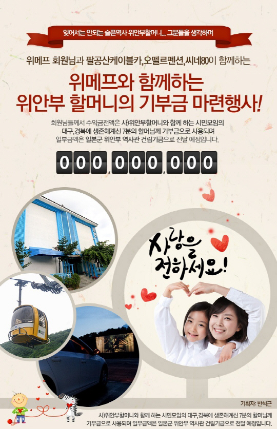 위안부 할머니들을 위한 기부금 마련행사도 진행한다. 위메프는 대구의 팔공산 케이블카, 오뗄르펜션, 씨네80과 함께 딜을 진행, 발생한 수익금 전액을 대구, 경북에 생존해계신 일곱분의 할머니들에게 기부금으로 전달한다. 또한 일부 금액은 일본군 위안부 역사관 건립 기금으로 전달할 예정이다.