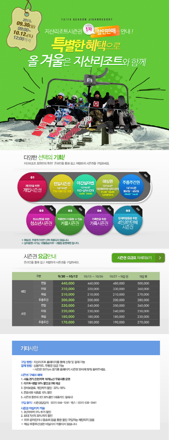 지산 포레스트 리조트가 자사 홈페이지(www.jisanresort.co.kr)를 통해 13/14 시즌권 1차 판매를 시작했다. 판매 시즌권은 전일시즌권, 야간심야권, 해심권(해피아워+심야권), 주중주간권 등 총 4종으로 스키, 보드 마니아들의 다양한 기호에 맞춰 운영된다. 조금만 서두르면 정상가보다 최대 29% 저렴하게 시즌권을 구입할 수 있을 뿐만 아니라 다양한 혜택도 제공받을 수 있다.