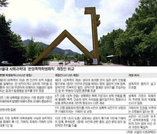 지난달 27일 11년 만에 개정된 '성폭력 사건 해결 및 성폭력 근절을 위한 학생회칙'에 따르면 가장 큰 변화는 성폭력 범위를 축소한 것. 기존의 '한 인간의 성적 자율권 침해', '성적이거나 성차에 기반을 둔 행위' 등의 모호한 내용을 '상대의 동의를 받지 않은 성적 언동', '인간의 존엄을 해치는 행위', '일방적 신체접촉이나 성적 모욕 발언' 등으로 구체화시켰다.