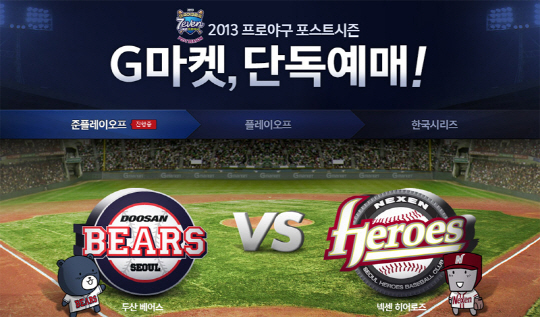 국내 최대 전자상거래 사이트 G마켓(www.gmarket.co.kr)이 2013 프로야구 포스트시즌 입장 티켓을 온라인과 모바일에서 단독 판매하고 웹, 모바일, 오프라인에서 참여 할 수 있는 다양한 이벤트를 진행한다.