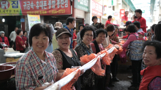 | 가래떡나눔행사에 참가한 시민들이 활짝 웃고 있다. |