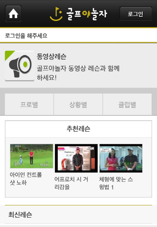 어디서도 볼 수 없는 골프야놀자만의 골프레슨 동영상을 프로별, 상황별, 클럽별로 볼 수 있게 하여 내가 원하는 레슨을 쉽게 찾아 볼 수 있어 큰 인기를 끌고 있으며 스마트폰으로 연습 전, 라운딩 전 시청 하면 큰 도움이 된다라는 사용자들의 반응이다.