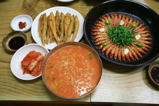 옥천 선광집의 생선국수와 도리뱅뱅이 생선튀김.