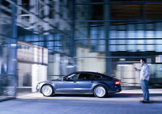 ◇운전자가 스마트폰으로 아우디 차량에 주차 지시를 내리고 있다.