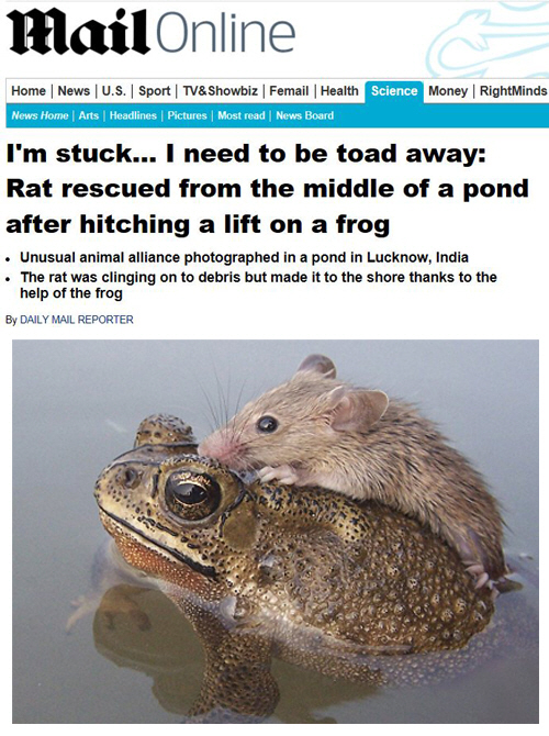 개구리가 쥐를 등에 업고 헤엄치는 모습이 포착돼 네티즌들의 눈길을 끌고 있다.