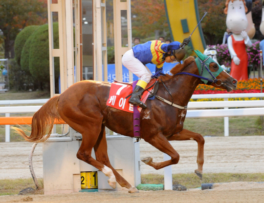 ◇내년 경마를 주도하게 될 2세마들의 첫번째 격전장인 제9회 과천시장배 대상경주가 열린다. 지난해 우승마 케이탑이 결승선을 통과하는 모습.