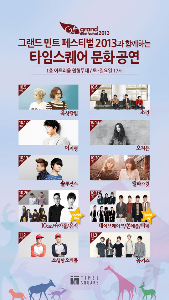 복합쇼핑몰 경방 타임스퀘어가 가을을 맞아 10월 한 달 동안 '그랜드 민트 페스티벌2013(이하 GMF)'과 함께하는 문화공연을 진행한다고 10일 밝혔다.