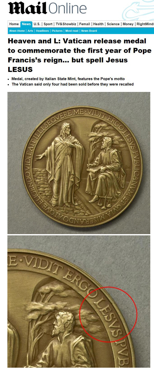 프란시스코 교황 선출 1주년을 기념하는 주화에 새겨진 예수 그리스도의 이름이 잘못 표기되는 해프닝이 벌어졌다.