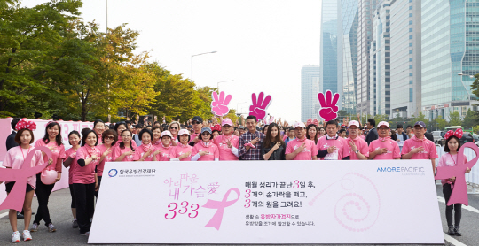 | 13일 서울 여의도공원에서 진행된 '2013 핑크리본 사랑마라톤 서울대회' 출발에 앞서, 행사에 참석한 아모레퍼시픽 부사장 이윤(맨 앞줄 우측에서 세번째) 등 VIP들이 유방자가검진 실천슬로건 '아리따운 내 가슴애(愛) 333'을 소개하고 있다. |