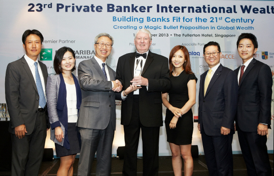 ◇하나은행은 11일 영국 금융전문지 'PBI'(Private Banker International)誌가 싱가포르에서 개최한´제 23회 Global Wealth Award 2013'에서 세계 유수의 프라이빗 뱅크들과 경쟁을 하여 '최우수 PB육성 및 개발 프로그램' 부문과 가장 혁신적인 비즈니스모델 부문에서 우수상을 수상 하였다고 밝혔다. 사진 왼쪽부터) 하나은행 싱가포르 서지수 지점장, 인도네시아 PT Bank Hana 임창혁 PB 센터장, 하나은행 PB본부 이형일 본부장, PBI John Evans 선임 에디터, 하나은행 PB사업부 김기정 대리, 하나은행 테헤란로지점 이태영 VIP PB팀장, 하나은행 골드클럽 박훈규 GOLD PB팀장
