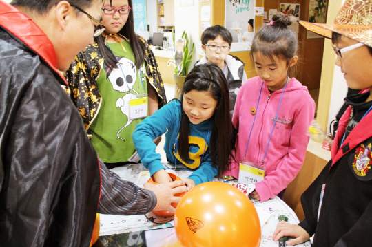 영어 학습 프로그램 외에도 '할로윈파티' 테마에 맞춰 과자를 이용해 몬스터 친구를 만들고 친구들에게 영어로 소개하는 '야미 스파이더(Yummy Spider)', 그룹으로 짝을 지어 함께 장애물을 지나 숨겨진 할로윈 단어를 찾는 게임 '보캡 고스트(Vocab Ghosts)', 정답이 있는 마녀모자에 링을 던져 점수를 얻는 OX퀴즈 '플라잉 위치(Flying Witch)' 등 외국의 놀이 문화를 간접적으로 경험해볼 수 있는 다양한 체험 활동 기회가 마련돼 눈길을 끈다. 박재호 기자 jhpark@sportschosun.com
