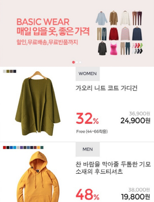 특히 모바일 패션 매출이 최근 한달 동안 전월대비 50% 이상 늘어나는 등 모바일에서의 패션 수요가 늘어나고 있어 전용 모바일 코너도 선보인다. 옥션 앱의 '인기기획전' 코너에서 '베이직웨어관'에 접속하면 핀터레스트(Pinterest: 핀보드처럼 원하는 관심사를 공유하는 소셜네트워킹 사이트) 스타일의 피드(feed) 방식을 통해 간편하고 손쉽게 상품정보를 볼 수 있다.