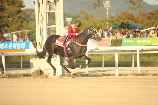◇제9회 과천시장배대상경주에서 라온모리스가 결승선을 통과하고 있다.