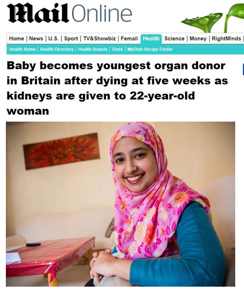 생후 5주된 신생아가 20대 여성에게 장기를 기증하고 세상을 떠나 감동을 주고 있다.