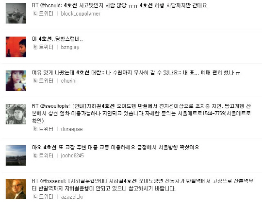 SNS에는 실시간으로 "지하철 4호선 고장, 사당역. 갑자기 열차에서 내리라면서 지하철 실내등 꺼진다.그리고 계속 당역종착이구...인파속에 갖혀버렸다. 어디로 가야하는지....열차운행 중단하나보다", "지하철 4호선 고장, 회사 직원들이 몇 안 되는데, 지금 다 4호선 열차 안에 있다", "지하철 4호선 고장, 지하철 4호선 반월역에서 전차선이상 발생으로 양방향 지연. 덕분에 지각", "지하철 4호선 고장, 미친 지하철 4호선. 여기저기 곡소리 장난아니다. 설국열차냐" 등 불만이 올라오고 있다.
